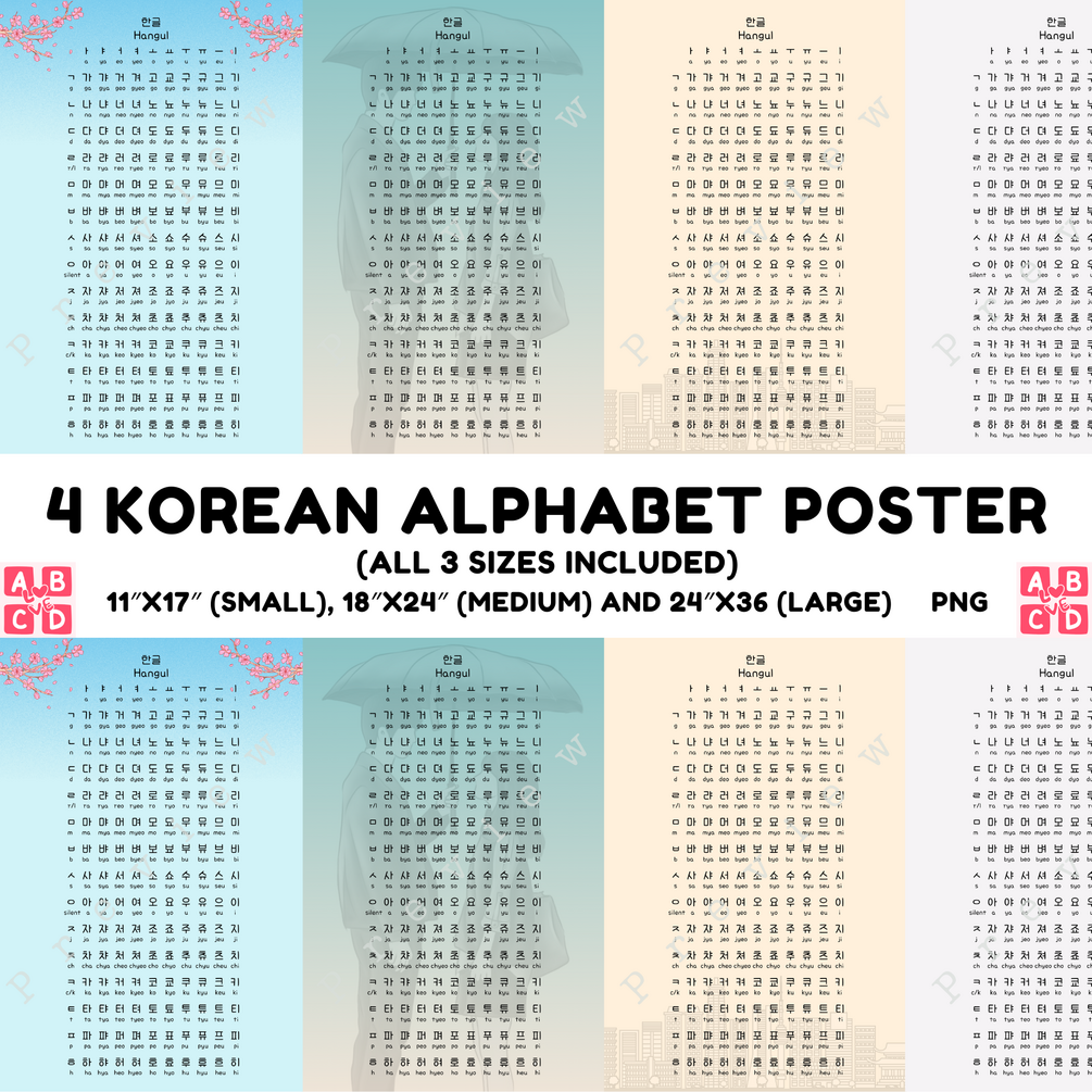 You'll get a set of four posters showcasing the complete Hangul alphabet in three sizes (11x17, 18x24, and 24x36) in PNG format. Each poster features all Hangul characters along with their pronunciation, making it an ideal educational tool and a unique decorative addition to any space.
