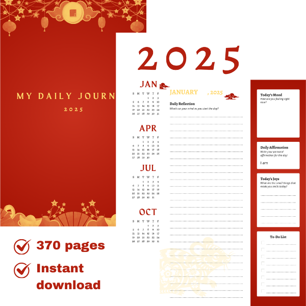 You’ll get 2025: My Daily Journal – Chinese Zodiac Edition, a beautifully designed 370-page journal that helps you reflect, set goals, and stay organized throughout the year. With sections for Daily Affirmations, To-Do Lists, Today’s Mood, Today’s Joys, and Daily Reflections, this journal provides structure while allowing flexibility for personal growth.